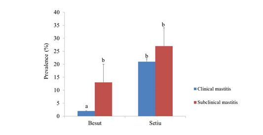 Prevalence of clinical and subclinical mastitis in the study area (P>0.05). Values (a & b) are significantly different within the study area according to category of mastitis