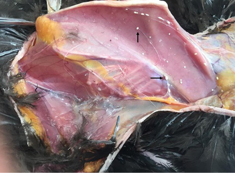 Calcified cysts of Laminosioptes cysticola (arrows) in the subcutaneous collagen in the region of breast
