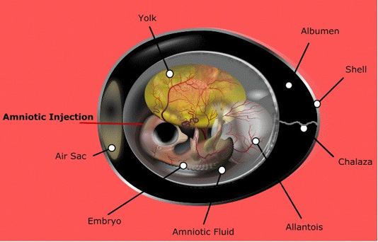 The in ovo injection in the amniotic fluid of chicken embryo