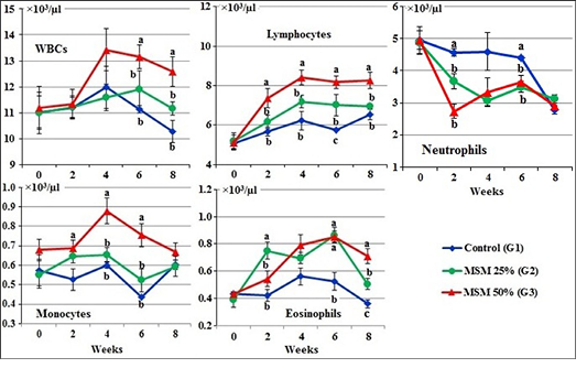 Leukogram of male goats fed different levels of Moringa oleifera seeds meal in ration during 8 weeks of treatment (Mean ± SE, N=5). Means with different letters in the same period are significantly different at P<0.05.