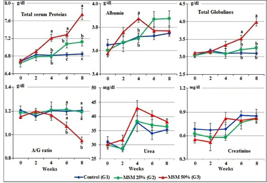 Serum proteins profile, urea, and creatinine concentrations of male goats fed different levels of Moringa oleifera seeds meal in ration during 8 weeks of treatment (Mean ± SE, N=5). Means with different letters in the same period are significantly different at P<0.05.
