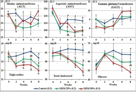 Serum enzymes activity, total cholesterol, triglycerides, and glucose levels of male goats fed different levels of Moringa oleifera seeds meal in ration during 8 weeks of treatment (Mean ± SE, N=5). Means with different letters in the same period are significantly different at P<0.05.