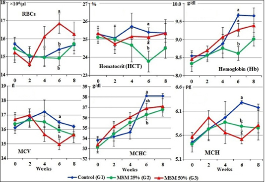 Erythrogram of male goats fed different levels of Moringa oleifera seeds meal in diet during 8 weeks of treatment (Mean ± SE, N=5). Means with different letters in the same period are significantly different at P<0.05.