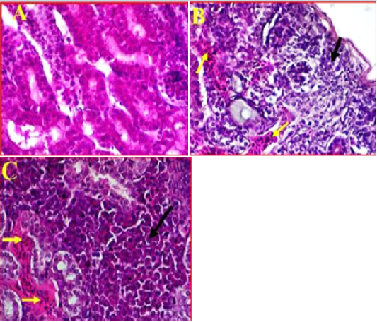 A- Illustrates a cross section of control or normal kidney tissue. (40X, H&E). B- shows the pathological changes exhibited in cortical region accompanied with sever infiltration with the inflammatory cells (black arrow) and sever congestion (Yellow arrows). (40X, H&E). C- shows multifocal necrosis and sever degeneration on the subcapsular area extended towards the medullary cones. (40X, H&E).