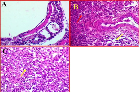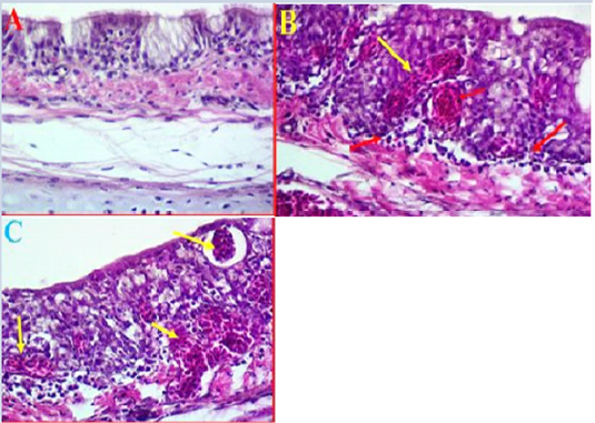 A- Histological changes in trachea of chickens infected with avian influenza (norml trachea). (40X, H&E). B- showed a clear degeneration in the epithelium and mucus gland with sever congestion and haemorrhage in trachea due to infected with LPAIV H9N2 (yellow arrows) (40X, H&E). C- Shows some pathological changes in trachea exhibited haemorrhage extended to sub mucosa and there was also observed vacuoles filled with blood (yellow arrows) (40X, H&E).