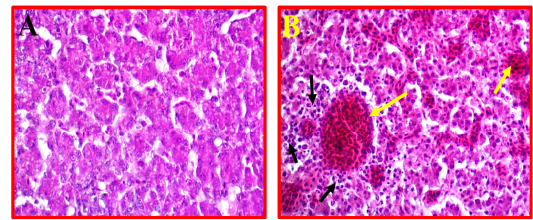 Shows control or normal liver. (40X, H&E). B- Illustrates pathological changes appeared as multifocal necrosis accompanied with infiltration with the many inflammatory cells (black arrows) and sever congestion (yellow arrows). (40X, H&E).