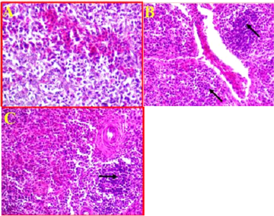 A- Illustrates a cross section of control or normal spleen. (40X, H&E). B- Shows the pathological changes revealed in splenic parenchyma accompanied with sever infiltration with the inflammatory cells (black arrows) and sever congestion. (40X, H&E). C- Shows inflammatory cells observed in peri-arteriolar sheaths with the prominent of fibrinoid necrosis. (40X, H&E).