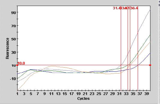 Smart cycle fluorography illustrating the RT-PCR detection of viral nucleic acid for the matrix gene of sample from experimentally infected chickens with LPAIV (H9N2).