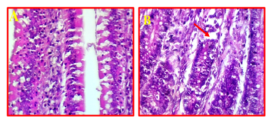 A- Shows normal intestine. (40X, H&E).B- Illustrates mild pathological changes presented in mucosal layer (red arrows). (40X, H&E).