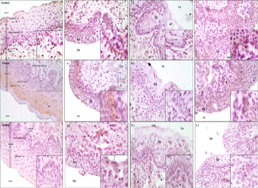 A) IHC analysis of PCNA protein in the vaginal tissue of mice. Black arrows is the protein detected point (magnification X400 in a small box and magnification X100 in a large box). a) D1 treatment group, b) D2 treatment group, c) D3 treatment group. Ep: Epithelium cell well, Lu: Lumen zone; B) IHC analysis of BCL-2 protein in the vaginal tissue of mice. Black arrows is the protein detected point (magnification X400 in a small box and magnification X100 in a large box). a) D1 treatment group, b) D2 treatment group, c) D3 treatment group. Ep: Epithelium cell well, Lu: Lumen zone; C) IHC analysis of BCL-2 protein in the vaginal tissue of mice. Black arrows is the protein detected point (magnification X400 in a small box and magnification X100 in a large box). a) D1 treatment group, b) D2 treatment group, c) D3 treatment group. Ep: Epithelium cell well, Lu: Lumen zone.