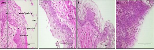 H&E-stained vaginal tissues after 24hr of treatment with D1, D2 and D3 (magnification, X400). Black bar=100 um. Control group: Normal vaginal epithelium cell of mice, a) D1 treatment group, b) D2 treatment group, c) D3 treatment group.