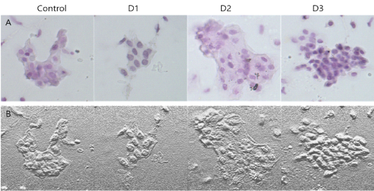 A: H&E staining of mouse vagina epithelial cells treated with D1, D2 and D3. B: Microscopic image analysis of mouse vagina epithelial cells for different treatment groups.