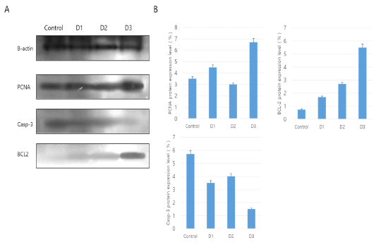 Western blot analysis for PCNA, BCL-2 and Caspase-3 (Casp-3) in vaginal tissue. The mean ± SEM of the treatment groups were normalized according to β-actin (Housekeeping gene) as a standard. A: Western blot analysis, B: Use of Image J program in NIH(Schneider et al.,, 2012).