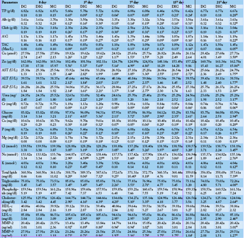 Comparison between the effect of the studied anti-inflammatory drugs on some biochemical parameters (N=10). Values are means ± SD.