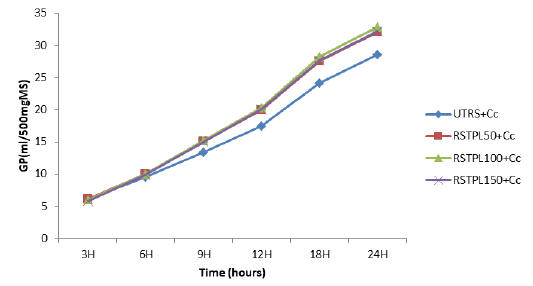 UTRS + Cc :Untreated rice straw + Calliandra calothyrsus leaves ; RSTPL50 + Cc : Rice straw treated with 50 g of plantains leaves ash extract + C. Calothyrsus leaves ; RSTPL100 + Cc: Rice straw treated with 100 g of of plantains leaves ash extract + C. Calothyrsus leaves RSTPL150 + Cc : Rice straw treated with 150 g of of plantains leaves ash extract + C. Calothyrsus leaves.