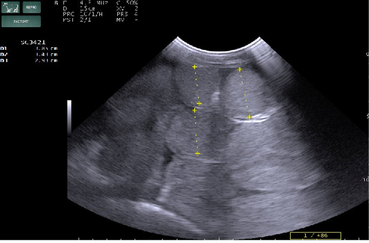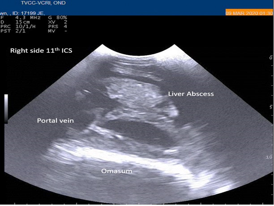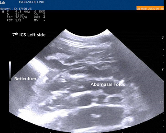 Percutaneous ultrasonography of left lateral thorax at 7th inter coastal space showed inflamed abomasal leaves with emptiness.