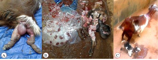 by abdomen puncture and foetotomy along with the foetal membranes; and (C): the doe and the kid on the next day after obsterical procedure.