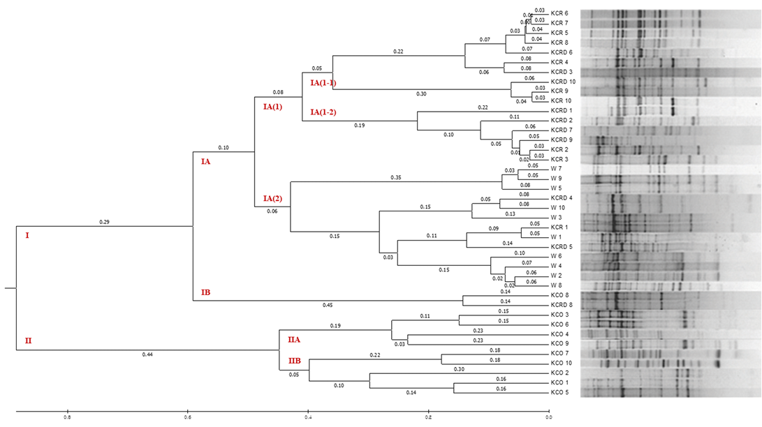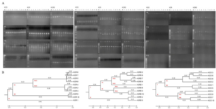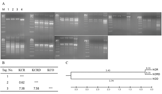 Analysis of polymorphic patterns in DNA samples. A: RAPD profiles using URP primer between Korean chickens. B: The unweighted pair group method of analysis (UPGMA) dendrogram based on summarized data regarding differentiation among chickens. KCR: Korean native chicken red, KCRD: Korean native chicken red-yellow (deep red), KCO: Korean chicken Ogol (Black-line).
