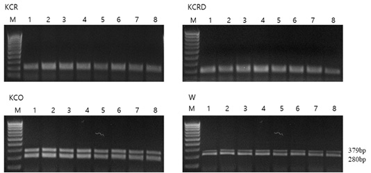 Genotype pattern of FM PCR (MC1R) diagnostic test products. All chickens with W and Black type phenotype carry the FM allele while all chickens with Red and Yellow-red type phenotype do not carry the FM allele. KCR: Korean native chicken red, KCRD: Korean native chicken red-yellow (deep red), KCO : Korean chicken Ogol (Black-line).