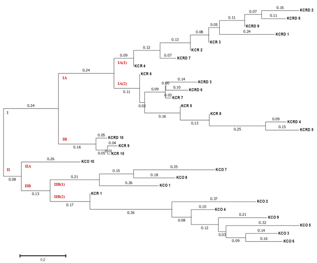 The unweighted pair group method of analysis (UPGMA) dendrogram based on summarized data regarding differentiation among Korean chickens. KCR: Korean native chicken red, KCRD: Korean native chicken red-yellow (deep red), KCO: Korean chicken Ogol (Black-line).