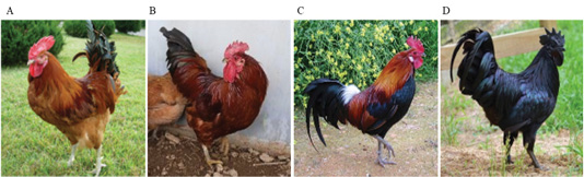 Photographs of the Korean native chicken breeds. A: Korean wild chicken (W), B: Korean native chicken Red-line (KCR), C: Korean native chicken Yellow-red line (KCRD), D: Korean native chicken Black line (Ogol; KCO).