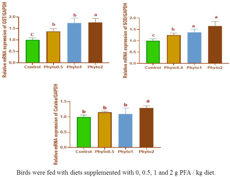 The influence of dietary PFA inclusion on relative mRNA gene expression profile of anti-oxidant enzymes (GST/GAPDH, SOD/GAPDH, and Catalase/GAPDH) of broiler chicks.