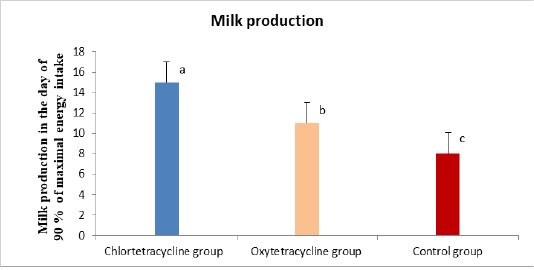 Milk production in the day of 90% of maximal energy intake (Liter) in Holstein Friesian cows with retained placenta after treatment with Chlortetracycline, oxytetracycline and non-treated control cows. Results were presented as Mean ± standard error. Values with different letters (a, b and c) differ significantly (P<0.05).