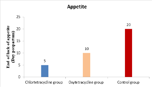 End of lack of appetite (day postpartum) in Holstein Friesian cows with retained placenta after treatment with chlortetracycline, oxytetracycline and non-treated control cows.