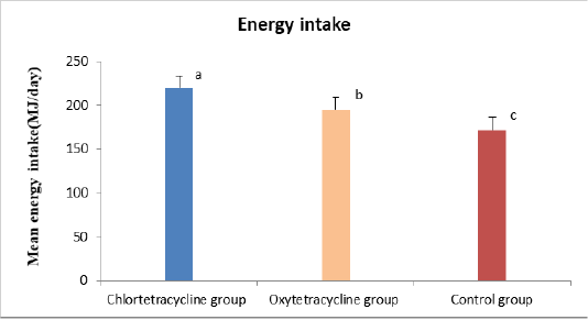 Mean energy intake (MJ/day) in Holstein Friesian cows with retained placenta after treatment with chlortetracycline, oxytetracycline and non-treated control cows. Results were presented as Mean±standard error.