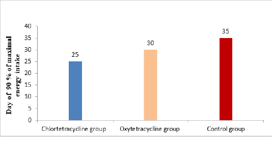 Day of 90 % of maximal energy intake in Holstein Friesian cows with retained placenta after treatment with chlortetracycline, oxytetracycline and non-treated control cows.