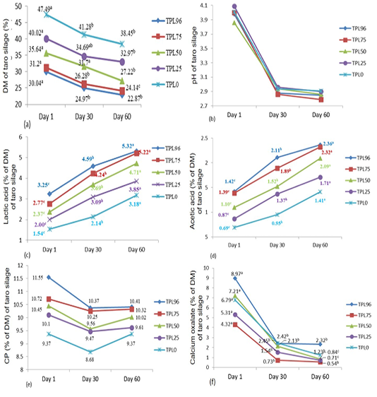 Changes of DM (a), pH (b), lactic acid (c), acetic acid (d), crude protein (e), and calcium oxalate (f) of taro silage of different treatments during ensiling