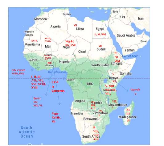 Map for African countries illustrate distribution of variable NDV genotypes.