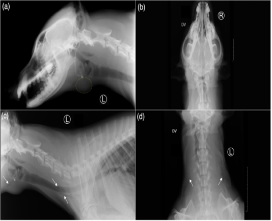 Radiographic views of the skull: left lateral (a) and dorsoventral (b), and the neck: left lateral (c) and dorsoventral (d) of the reported case. (a) There is presence of a rounded soft tissue or fluid opacity structure with distinct margin just ventral to the larynx (marked with yellow dotted circle). (c,d) On both left lateral and dorsoventral radiographs of the neck, multiple small rounded air opacities coalescing to linear gas opacities (white arrows), noticed in bilateral fascial planes of the neck indicating cervical soft tissues emphysema.