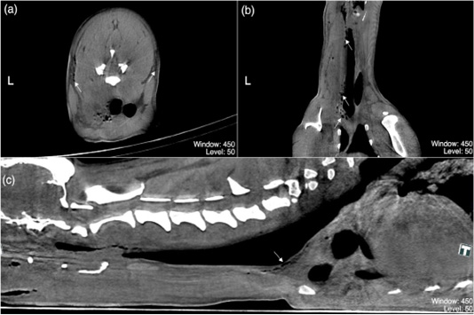 (a–c) are post-contrast multiplanar reformation (MPR) acquisitions of the neck region of the dog in present case study representing (a) transverse plane at the level of C5, (b) dorsal and (c) sagittal planes. Multiple small rounded gas-attenuating densities coalescing to form linear gas–attenuating densities peripheral to the fascial planes, oesophagus, and trachea (white arrows); indicating cervical soft tissues emphysema. Any piece of wood or splinter resembling structures were not identified from these CT acquisitions. (Window: 450; Level: 50)