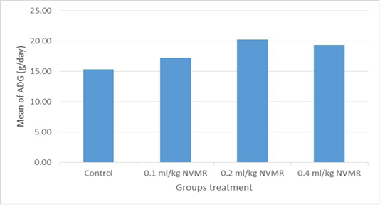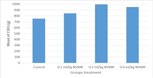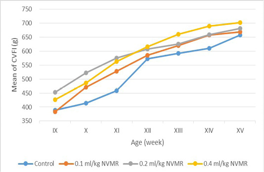 Cumulative body weight gain of grower roosters after treatment of NVMR