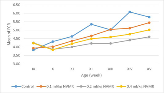The feed conversion ratio of grower roosters after treatment of NVMR
