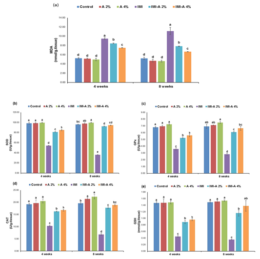 Effect of dietary Azolla pinnata supplementation on hepatic oxidative stress markers of Nile Tilapia influenced by sublethal IMI-polluted water for 8 weeks. Values (means ± SE) with different superscripts are significantly (p˂0.05) different in the same row. Azolla pinnata (A), imidacloprid (IMI), (a) Malondialdehyde (MDA), (b) Superoxide dismutase (SOD), (c) Glutathione peroxidase (GPx), (d) Catalase (CAT), (e) Reduced Glutathione (GSH)