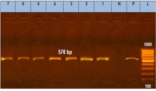 Agarose gel electrophoresis showed PCR products of E. coli tetA. N: represents negative control. P: represents positive control of tetA gene (576 bp). Lane L was within 100–1000 bp DNA ladder (1–7) positive to tetA gene.