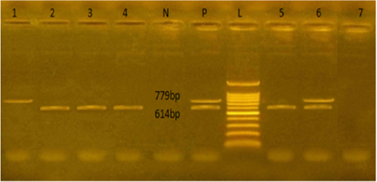 Agarose gel electrophoresis showed PCR products of E.coli stx1and stx2 genes amplified at 614 and 779 bp respectively from seven isolates. L: representing the molecular size marker (100 pb plus ladder). Lane 1 was positive to stx2, lanes 2,3,4, and 5 were positive to stx1. Lane 6 was positive to stx1 and stx2, and lane 7 was negative to stx1 and stx2. N: represents control negative, P: control positive