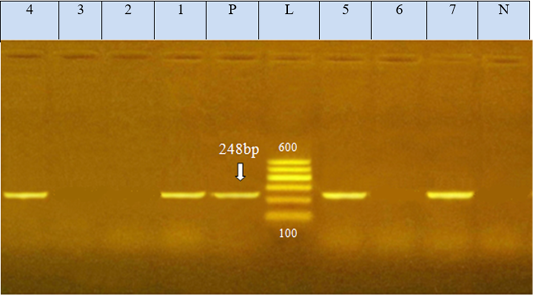 Agarose gel electrophoresis showed PCR product of E.coli eae gene amplified at 248 bp from seven isolates, N: represents negative control; P: represents positive control of eae gene (248 bp). L: represents the molecular size marker (100pb plus ladder). Lanes 1, 4, 5, and 7 were positive to eae gene. Lanes 2, 3, and 6 were negative to eae gene.
