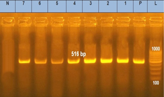 Agarose gel electrophoresis showed PCR products of E .coli blaTEM. Lane L was within 100–1000 bp DNA ladder. N: negative control; P: positive control of blaTEM gene 516 bp. Lanes 1–7 were positive to bla TEM gene