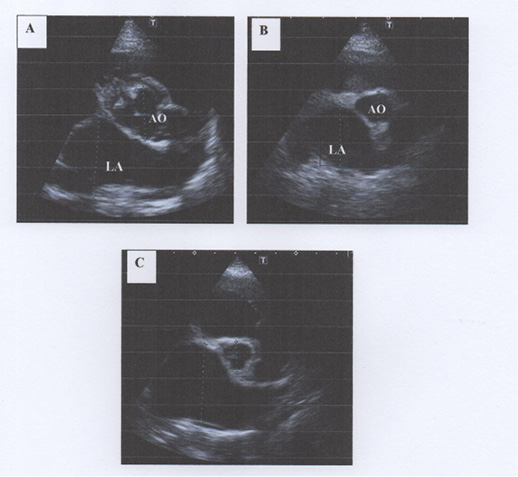 Dilation of left atrium (LA) on right parasternal short axis left atrium/aorta (AO) view. A: Mild dilation of left atrium with LA to Aorta ratio of 1.56, B: Moderate dilation of the left atrium with LA:Ao of 2.04 and C: Severe dilation of left atrium with LA:Ao of 2.47. Note that the normal LA:Ao ratio should be <1.3 (Reproduced from Rishniw et al., 2000)