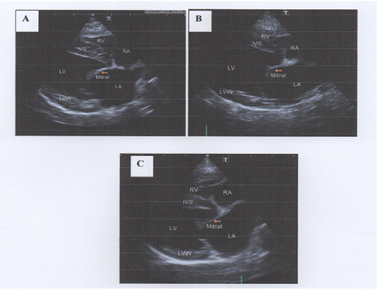 Thickened mitral valve at right parasternal long axis four-chamber view. 2-A: Mild thickening of mitral valve, 2-B: Moderate thickening of mitral valve and prolapse of the anterior leaflet, 2-C: Severe thickening of mitral valve and mitral valve prolapse (MVP) of the anterior leaflet towards left atrium.