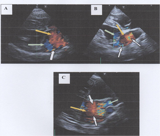 Degree of mitral regurgitation (MR) into left atrium at right parasternal long axis four chamber view using Doppler echocardiography. In 3-A, there is mild mitral regurgitation in to left atrium with mild baseline colour scale is shifted and presence of less than 10% of colour aliasing. In 3-B, there is moderate mitral regurgitation with moderate baseline colour is shifted and presence of 50% of colour aliasing. In 3-C, there is severe mitral regurgitation with severe baseline colour scale is shifted and presence of more than 50% of colour aliasing. Note: Yellow arrows show shades of red indicates the bloods flow towards transducer; Green arrows show shades of blue indicates the blood flow directed away from transducer; White arrows show the presence of colour aliasing).
