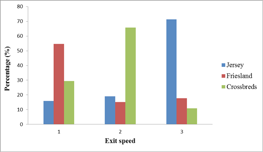 Exit speed of the three primiparous genotypes. Score definitions: 1: walking, 2: trotting, 3: running.