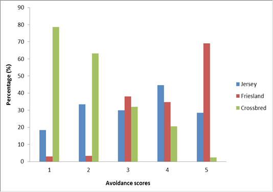 Score definitions: 1: The cow avoided the observer at a distance of more than 2 meters., 2: The cow avoided the approaching at a distance of between 1 and 2 meters., 3: The cow accepted the observer at a distance of 1 meter but avoided him when arms were outstretched., 4: The cow accepted the observer when arms were outstretched, but avoided him when touched., 5: The cow accepted to be touched by the observer.