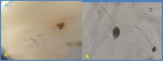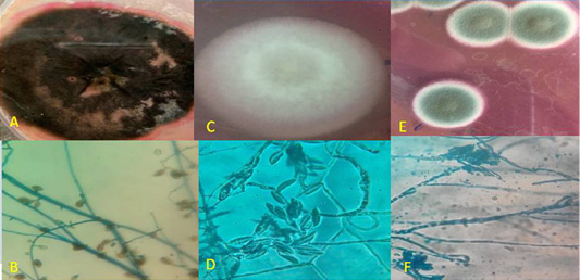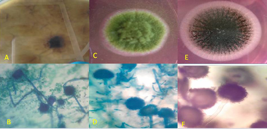 Macroscopic and microscopic by Lacto phenol cotton blue (LPCB) wet mount slide prepared from a micro-culture technique of Dematiaceous, Fusarium sp. and Penicillium sp.