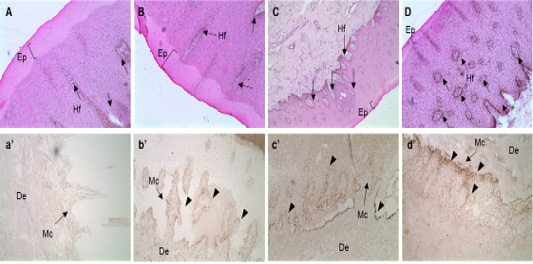 In situ hybridization of MC1R mRNA in the follicular zone of cattle. Black bar = 100 μm. Black arrows indicate MAP1LC3A RNA probe detection. MC1R probe was made using NCBI genetic information EU169234, sequence is “ctgtgtctga cttgctggtg agcgtcagca acgtgctgga gacggcagtc atgccgctgc tggaggccgg tgtcctggcc acccaggcgg ccgtggtgca gcagctggac aatgtcatcg”. A, B, C and D: H&E staining of skin tissues of cattle. a’, b’, c’ and d’: in situ hybridization of MC1R probe detection dots. *, ** Different letters within the same column represent a significant difference (p<0.05). A-a’) Hanwoo (HC), B-b’) Korean brindle cattle, C-c’) Korean dark cattle, D-d’) Holstein cattle. Hf: Hair follicle, Ep: epidermis, Mc: Melanocyte zone, De: dermis. A–D: 100X magnification; a’-d’: 200X magnification.