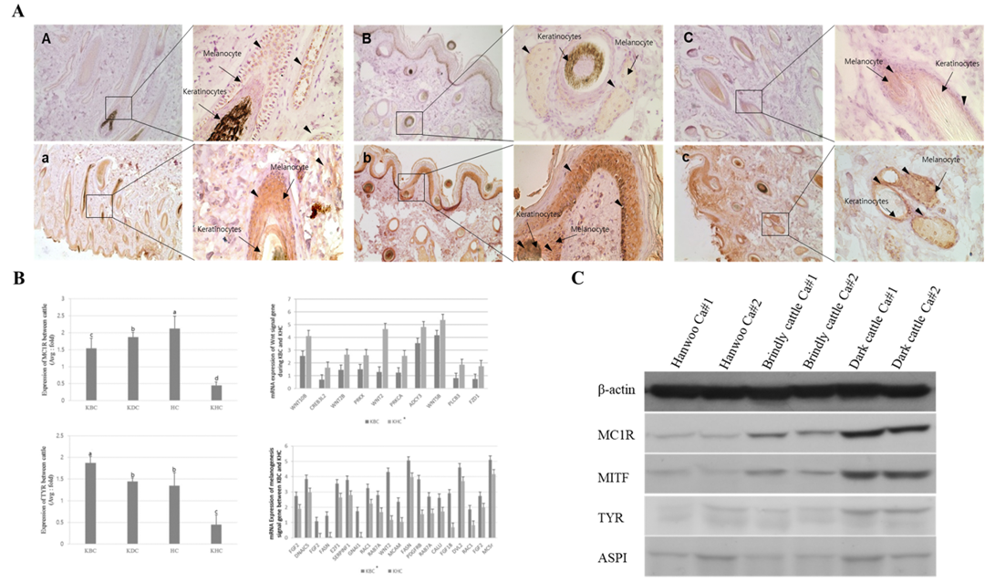 Expression analysis of melanogenesis-associated genes between the Korean native cattle. A: Immunodetection of MC1R and TYR protein A-D) Detection of MC1R protein, a-d) Detection of TYR protein, A-a) Hanwoo, B-b) Korean brindle cattle, C-c) Korean dark cattle. B: Real-time qPCR analysis of melanogenesis-associated genes, where KBC) Korean brindle cattle, KDC) Korean dark cattle, HC) Holstein cattle, KHC) Korean Hanwoo cattle. The bars represent the average fold changes in 3 independent experiments (±SD). C: Western blot analysis.