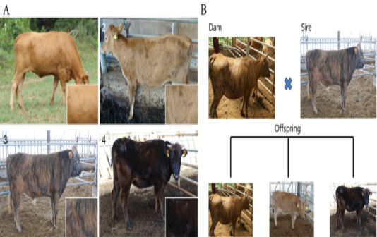 Different patterns of expression of coat color between Korean native cattle (Kim et al., 2013). A: Differences in the cattle coat color determined by the ratio of Yellow: Black. 1) Hanwoo (10:0), 2) Korean brindle cattle (Brindle coat color type 1 (9:1)), 3) Korean brindle cattle (Brindle coat color type 2 (4:6)). B: The difference in the coat color of the offsprings was evaluated based on the crossbreeding of the cattle.